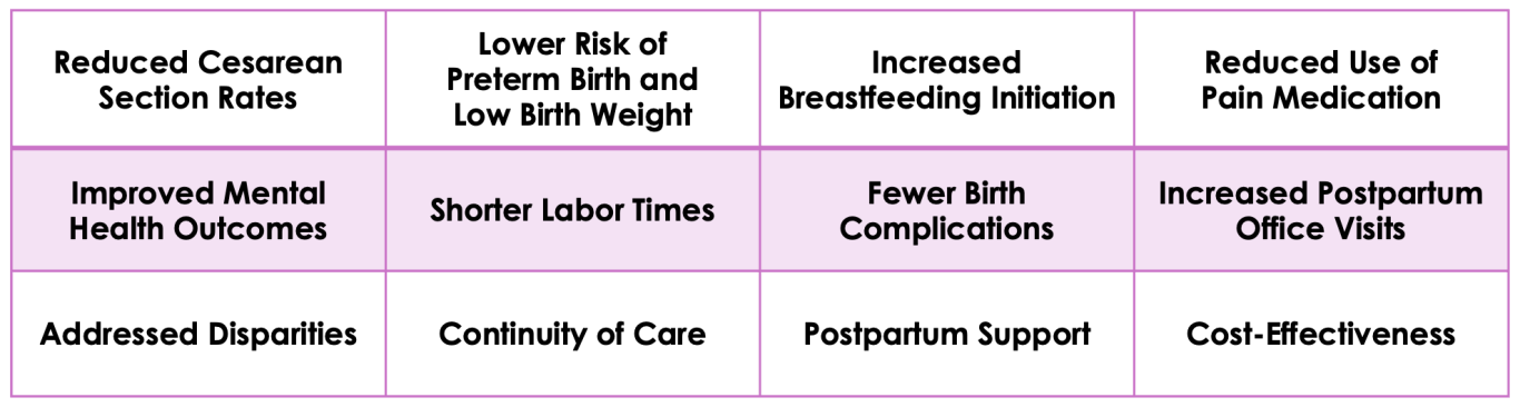 This support increases the rate of vaginal, unmedicated labor and delivery, decreases the use of pharmacological medications, and reduces the need for medical interventions.